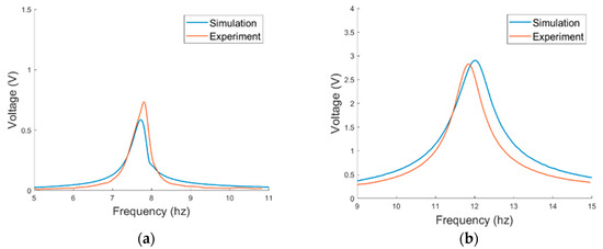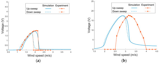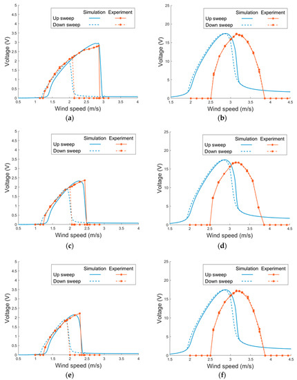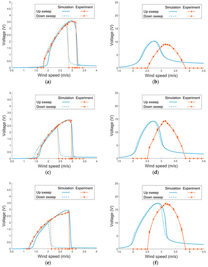 The proposed PEH was then examined in the wind tunnel tests. As the system was non-linear, the voltage responses were examined under wind-speed sweeps to see how the nonlinearity influence the responses. The PEH without magnets was first tested. Figure 14 depicts the simulated and experimental voltage responses of the PEH. The viscosity coefficient β and vortex-related coupling coefficient K were obtained via experiments and are shown in Table 3. It can be seen that the model predicts well the responses of the horizontal mode in both up and down sweeps. The model is accurate enough even without taking the geometric non-linearity into consideration. The non-linearity caused by the VIVs demonstrates the hardening effect, which enlarges the lock-in region for up sweeps. On the other hand, the non-linear effect is not notable in the vertical mode. The responses in up and down sweeps are almost identical in both the simulation and experimental results. It can be noted that the experimental lock-in region is shifted to a higher region when compared with the simulation results. The mismatch may result from the deformation of the PEH by the wind pressure, which strengthens the stiffness of the structure and, therefore, increases the lock-in wind speed in experiments.