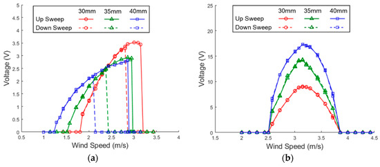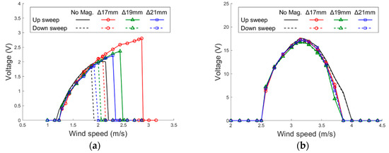 The experimental results of the PEH with different settings of magnet gap are arranged in Figure 16. It can be noted that the magnetic force improves the lock-in wind speed range and peak voltage in all the three settings of the horizontal mode. It can be seen that the magnet force influences the horizontal mode greatly but has little impact on the vertical mode. That is because the magnets are attached on the end of the side beams, where the displacement is almost zero in the vertical mode. The performance improvement is more significant as the magnet gap is reduced. The PEH demonstrates better performance in up sweeps than down sweeps because of the hardening effect. Moreover, it is noted that the magnet-integrated PEH outperforms that without magnets not only in the up sweeps but also in the down sweeps. In the setting with the gap of 17 mm, which shows the most significant improvement among all settings, the lock-in region is widened by 34.8% and the peak voltage is enhanced by 33.2% in the up sweeps. In the down sweeps, significant improvement of both the peak voltage and lock-in region can still be seen. Overall, adding magnets to the design of the U-shaped PEH improve peak voltage and usable wind-speed region in both up and down sweeps.