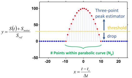 For the three-point peak estimator, it is assumed that the curve region near the peak can be well approximated by a second order polynomial function such as Equation (1):