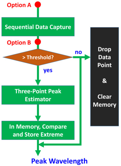 The detected spectrum curve is synchronized in the x-coordinate in the central processor. Then, peak detection is performed, as shown in Figure 2. The spectrum response curve is sampled and captured sequentially. The sampling rate must be sufficiently high to ensure that there is a sufficient number of data points within the region of the FBG peak (this will be discussed below). The intensity of each data point is compared with a pre-set threshold level. All data points with an intensity below this threshold are dropped directly. The three-point peak estimator is triggered once data points with an intensity higher than the threshold level are detected. The selection of data points for different types of processing is briefly shown in Figure 1.