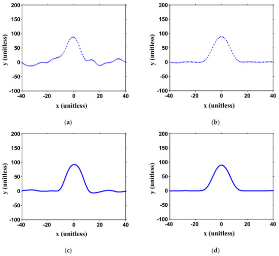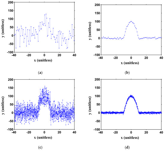 Emulated captured curves under different conditions. (The ideal curve above the noise level is set as y = −x2 + 100). Left column (a,c): signal-to-noise ratio (SNR) = 10 dB; right column (b,d): SNR = 30 dB; top row (a,b): Np = 20; bottom row (c,d): Np = 200. Np: number of points within the parabolic curve. Curves are unitless as illustrated in Figure 1.