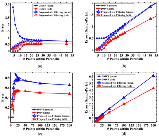 Figure 4 shows the peak detection error for the DMVR and our proposed scheme at SNR = 30 dB. Comparing Figure 4a,c, it is observed that the low sampling rate results in reduced detection error for our proposed scheme, as explained for Figure 3b,d. However, DMVR performs less well at low sampling rates, which instinctively contradicts the discussion for Figure 3b. This can be explained by Figure 4b,d, which normalized the error in the unit of the sample period. With this coordinate transformation, the detection errors increase with a higher sampling rate for both schemes. From this direct observation, it is emphasized that a low sampling rate results in reduced peak ambiguity, but this does not always lead to a low detection error. At high sampling rates, though there may be more ambiguous peaks, these peaks may locate within a limited region. Though this region may occupy multiple sample periods, it can be sufficiently small compared to the final readout error. Since the detection error is not dominated by the peak ambiguity, the error at high sampling rate can be lower than expected. From Figure 4a,b, it can also be seen that the proposed scheme offers significant accuracy improvements at low sampling rates. This improvement degrades with the increases in peak ambiguity. Comparing Figure 4c,d, though more ambiguity is observed at higher sampling rates, the detection error still slowly decreases with higher sampling rates. Finally, as a reference to the next discussion, the detection error is approximately 0.25 at Np = 4 (for the best performance), which is about 3~10 times (respectively, for the worst and best conditions for the following discussion) higher before the following filtering operation is performed.