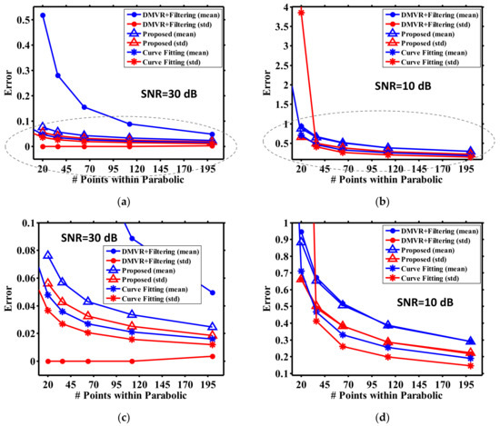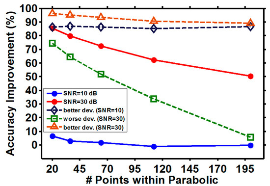 In particular, the accuracy improvement of our proposed scheme from the DMVR method is discussed, as shown in Figure 7. At high SNR (SNR = 30 dB) conditions, the average relative accuracy improvement reduces, as the sampling rate is high. This corresponds to the discussion for Figure 6a. However, even if the number of data points within the parabolic curve is 200, a ~50% improvement can still be anticipated. Considering the standard deviation of the errors, the green-square and brown-triangular curves show the potential improvement variations from the average results. It can be seen that a more than 90% potential improvement can be expected even at high sampling rates, which instinctively contradicts the discussion of Figure 6a. This comes from the fact that the average and standard deviation errors converge towards specific floor levels at high sampling rates. As shown in Figure 6, the floor levels are higher than zero for all conditions. Hence, at high sampling rates, while the performances between the two schemes converge, the random accuracy fluctuations cause that the DMVR method occasionally performs worse than the proposed scheme. Consequently, a high accuracy improvement can still be expected at a high sampling rate. However, this is just a random behavior and has no practical information. On the other hand, the performance improvement of the proposed scheme can also degrade even more quickly than the average improvement. It can be seen that, while the number of data points within the parabolic curve is 200, the improvement can be negligible with the effects of random accuracy fluctuations. At the low SNR (SNR = 10 dB) condition, the average accuracy improvement from our proposed method is small. This corresponds to the discussion of Figure 6d. Similar to the high SNR condition, higher accuracy improvements can be expected once the random accuracy fluctuations are considered, as shown in the dark-blue diamond dash line. The difference between the levels of improvement is determined by the relative levels between the converged average and standard deviation error floors. The reduced accuracy improvement line from random fluctuations is not plotted for the low SNR condition. It can be seen that the average accuracy improvement is already small. With the considerations of the random fluctuations, DMVR can sometimes offer better accuracy than the proposed method. This will result in a negative accuracy improvement. However, as the results fall behind random behaviors, as discussed above, they do not provide any meaningful information.