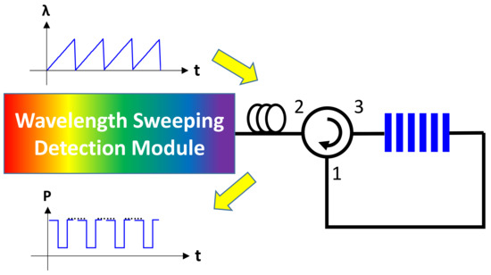 The most direct option to detect the FBG wavelengths is to monitor the overall system spectrum through an optical spectrum analyzer (OSA) [3]. However, for most commercial OSAs, the wavelength resolution is >0.01 nm. This limits the readout resolution of the physical parameters. Additionally, the scanning speed of OSAs is typically slow, which is disadvantageous for real-time applications. Various different architectures have been proposed to improve the resolution and speed of the interrogation systems by estimating the wavelength shifts through different measurable parameters, such as power [4,5], frequency [6,7], and time [8,9,10]. These parameters can be quickly and accurately measured with mature electronic devices; hence, improving the sensing performance.