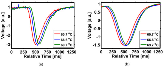 The time traces of the captured signals for different temperatures are shown in Figure 9. It can be observed that the signals for different temperatures shift in association with the relative detected time. The time shifts can be transformed to equivalent wavelength shift values, as described in [8,9,10]. Due to the impact of noise, the received signal traces fluctuate at an observable level, as shown in Figure 9a. As described in Figure 3, this will degrade the accuracy of the peak detection processes because of the ambiguous peaks. In order to eliminate the noise, a 1.25 Hz digital low-pass filter is applied. The peak ambiguity is greatly eliminated by the filtering process, as shown in Figure 9b. It should be noted that the received curve is not parabolic nor Gaussian as many studies have pre-assumed [11,12,13,14,15,16,17,18]. We believe this special curve shape comes from the slow response of the power detector and can further vary while different receivers are applied. However, this reveals the potential that, in a more general application scenario, the great sensing performance from curve fitting may be degraded to a greater degree than is anticipated because of unexpected factors which change the curve shapes.