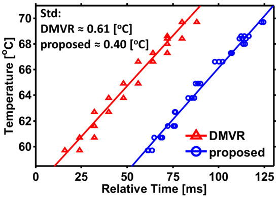 The sensing performance of the proposed scheme compared to the DMVR method is shown in Figure 10. It can be observed that the temperatures and the relative peak time shifts behave in a linear relation. The parameters of the regression line are shown in Table 2. In order to clearly show two curves in the same picture, the x-axis of the curves is intentionally shifted. As only the relative peak time shifts are physically meaningful for the interpretation of temperatures, this will not influence the discussion of the sensing performance. According to the slopes of the curves, both curves show sensitivities of about 0.16 °C/ms. For each value of the peak time shift (i.e., variable t of the curve), the calculated temperature (T) on the regression curves are considered as the ideal value. The ideal value is compared with the measured result. The standard deviations for both processing schemes are, respectively, 0.6133 °C and 0.4021 °C. Through the proposed method, about 34% relative accuracy improvement is observed. The correlation coefficient of the proposed scheme is also higher than the results calculated for the DMVR method. This comes from the grid-like behavior of the DMVR data points. As mentioned above, the readout resolution of DMVR is limited by the sampling rate. Even if the peak is appropriately detected by DMVR, the peak coordinates only locate at the grids of the integer sampling period. This causes the data points in Figure 10 to jump discretely for DMVR and reduces the final correlation coefficient. It can be seen that through the proposed scheme, the peak coordinates are not limited to the grids of integer sampling period, and the correlation coefficient increases.