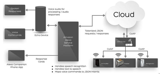 Architecture of a voice assistant (Alexa) (https://www.faststreamtech.com/blog/amazon-alexa-integrated-with-iot-ecosystem-service/). (access on 10 February 2021) [].