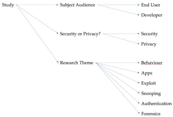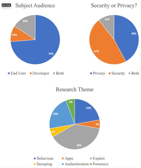Instead of a single set of broad topics into which each of these studies could be categorised, we decided to approach each paper on three different levels, in line with the research questions posed in Section 1.3. The papers were divided into three categories: Subject Audience, Security and Privacy, and Research Theme. Figure 4 shows a visual representation of the breakdown of the individual categories.