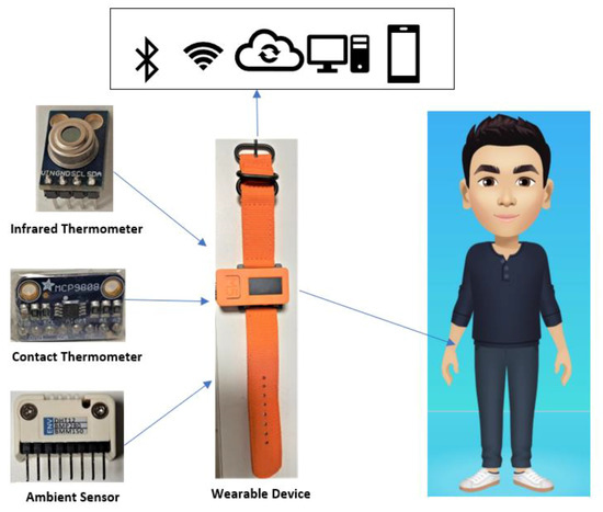 The thermometer is the indispensable sensor because fever is the most apparent symptom of COVID-19 infection. The contact thermometer is equipped with the user to follow the Tbody, archiving high accuracy directly, but it requires a long holding time. The infrared thermometer [37] consumes a short time to display the Tbody, but it is less precise than the contact one. This project approaches both methods: the contact-digital thermometer is mounted with the wearable device for long-time usage. The infrared thermometer is connected to the device used when the user wants to free the hand from the wearable device.