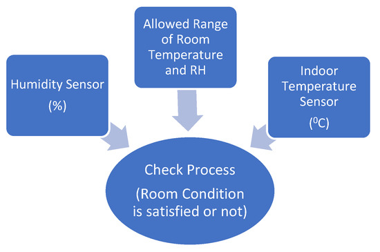 The Tindoor and RH are two crucial factors to prevent the spread of COVID-19. As discussed early, the advised Tindoor should be maintained between 20 °C and 24 °C, while RH should be maintained between 20% and 60% [18]. The ambient sensor measures the surrounding environment’s temperature and humidity and converts the input data into the corresponding electrical signal to monitor the indoor changes. The quarantined person can adjust the room condition by modifying the air conditioner, heater, or air humidifier based on the sensor data. In the winter, the temperature is low and drier, especially in Europe, so the family of the quarantined person should take into account the indoor conditions. The ambient temperature and humidity surrounding the quarantined person are updated each 5 s using ambient sensor, as shown in Figure 2.