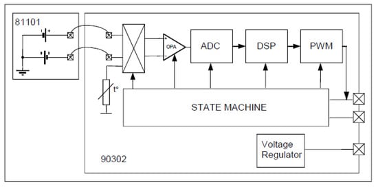 - The output of the IR sensors is amplified by a low-noise chopper amplifier (OPA) with programmable gain, converted by a high-resolution Analog–Digital Converter (ADC) to a single bitstream and fed to a digital signal processing for further processing.