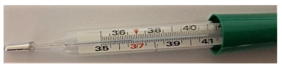 To achieve good measurements, the digital thermometers were calibrated by using the glass thermometer, which is traditionally used for body temperature checking, as shown in Figure 6. This regular thermometer has trustable indication which requires significant time of body contact to provide the result.