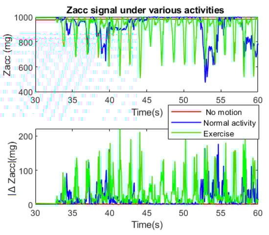 Under the no-motion condition, the Zacc maintains constant value without any spikes, so the |ΔZacc| is always almost zero. Regular activity can cause some sudden variations, but it is easy to realize that the signal behavior is random with small |ΔZacc| at low frequency. On the other hand, if the user does physical exercises, the Zacc frequently varies with high repetitive spikes due to considerable motions that cause |ΔZacc| changes repetitively with significant value.