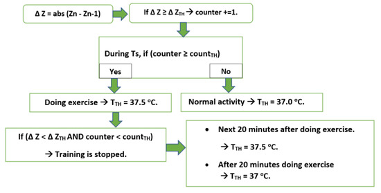 For the proposed system, Ts = 30 s; ΔZTH = 90 mg; countTH = 24. These values are suitable for exercise recognition, which can be modified depending on the user. However, if the user trains extremely soft exercise, it will not be enough to increase the Tbody. In this case, the user desires to consider this activity as exercise, so ΔZTH and countTH can be decreased manually. Smaller ΔZTH realizes softer motion and vice versa, countTH relates to motion speed. ΔZTH = 90 mg is suitable threshold to realize the strong action as training motion as shown in Figure 7.