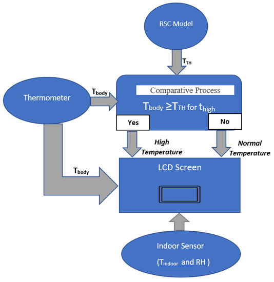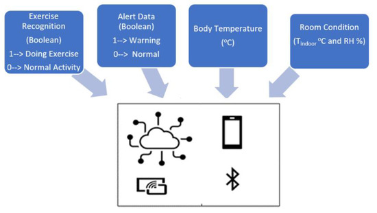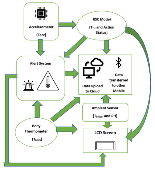 Figure 11 summarizes the total operating procedures of the designed system. The MEMS accelerometer has the role of acquiring acceleration which is used for the activity recognition by RSC model. The TTH is adjusted automatically then compared with the Tbody for a body temperature check from the recognition stage. The ambient sensor collects the indoor statistics. The alert message is sent in the case of high temperature occurs continuously for a specified time. All the necessary data are sent to the LCD screen for the user and other shared devices via Bluetooth or Wi-Fi stored in the cloud.