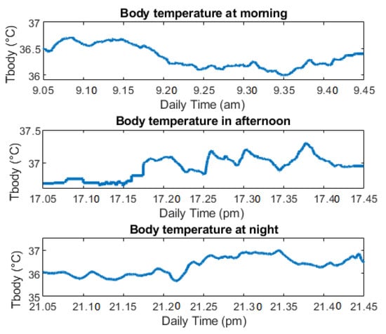 Figure 15 illustrates the data of the Tbody after three repeats of measurements. Although the digital thermometer has variation, the Tbody is still always in the allowed range without any noticeable points. The temperature after exercising was slightly increased, compared with other times. At night, the user temperature returns to routine temperature, close to the morning temperature. Due to the multiple activities, the Tbody has variability. The standard deviation (Std) is about 0.2 °C, which shows the variation of the measurement, with respect with average temperature. However, the average temperature is always under the TTH, so there is no alert message reported in Table 1.