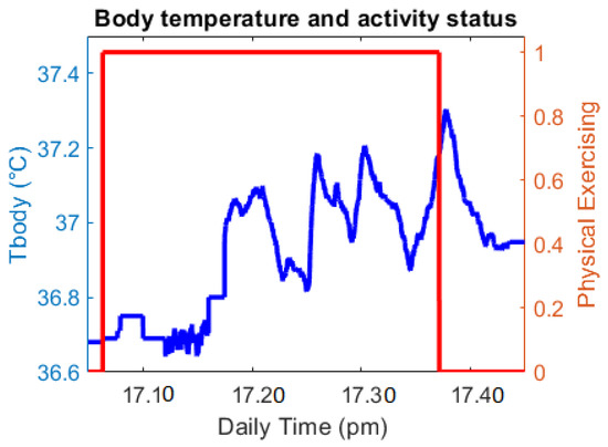In this part, the exercising time is analyzed as Figure 16. The red line shows whether the quarantined person is doing physical exercise by using Boolean (1: Yes; 0: No) as described early. In this period, the Tbody has a larger variation and a higher mean value than regular activity. After the exercise, the Tbody still increases and gradually reduces later. With the information of exercising status, the family members/doctor can understand this temperature growth.