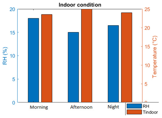 The data of indoor conditions were also collected to visualize in Figure 17. The RH is a little bit lower than expected humidity, especially in the afternoon due to European winter’s dry atmosphere. However, the quarantined person already tried to adjust the room conditioner for better RH at night. The Tindoor is quite good, which is suitable for living conditions, as recorded in Table 3.