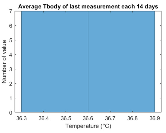 The wearable device data were obtained to calculate the average Tbody of the last time use per day. It is vital to judge the thermal body to guarantee everything is under control at the end of the day. Figure 18 and Table 4 show the average temperature of the last measured time every day (usually at night). There are seven values of Tbody of the last measurement each 14 days. All of the values are located in the normal range from 36.3 °C to 36.9 °C which does not exceed the TTH (37 °C).