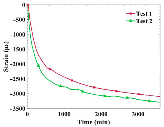 The curing test of the potting material was carried out twice at room temperature, and these were recorded as Test 1 and Test 2. The aluminum shell and the PCB were the same size in the two tests. The strain trend measured during the curing process is shown in Figure 3. It can be seen that the curves of strain show a law of quadratic linear change. The strain in the negative direction of the PCB changed rapidly within 600 min, and then the rate of strain reduction gradually slowed down. At this time, the potting adhesive gradually solidified. A negative strain indicates that the PCB was stretched inward due to the shrinkage of the potting adhesive, and the maximum was −3297.6 με. Both tests verified that the PCB was subjected to large tensile stress due to the shrinkage of the potting adhesive, and the direction of this shrinkage tensile stress was consistent with the inertial force, which made the PCB more easily damaged.