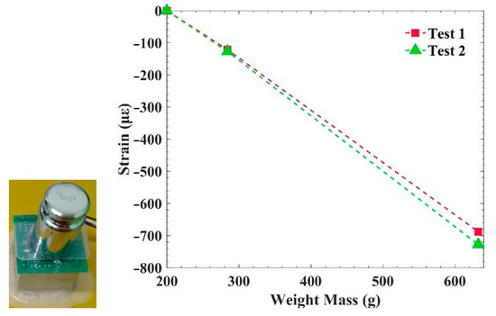 The changes in strain in Figure 4 show that the deformation direction of the PCB caused by weight gravity is consistent with that caused by the potting adhesive’s shrinkage stress, and the strain of the PCB is around −728.1 με when the weight gravity is 633 g. This phenomenon verifies that the shrinkage stress occurs contrary to the acceleration direction, which indicates that the PCB may receive a certain deformation in the direction of acceleration before launch. At the same time, it can be seen from the results that the shrinkage stress and strain caused by the potting adhesive are relatively large, able to reach the effect of loading hundreds of grams.