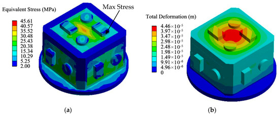 We established a three-dimensional numerical model of the device. The shell frame was set as aluminum, the size of which was around 40 mm × 40 mm × 40 mm; the upper part and the side of the shell were made of three PCBs, and the inner part was filled with polyurethane. The equivalent stress and deformation of the inertial electronic devices under acceleration overload impact were calculated by the finite element method in the ANSYS environment; the results are shown in Figure 5.