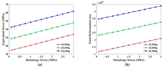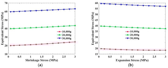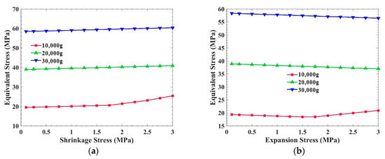 Figure 9 shows the equivalent stress of the PCB, with shrinkage stress inside, under three different overloads. The plane of this PCB is parallel to the overload direction. In Figure 9a, the equivalent stress rises slowly with the increase in shrinkage stress under 20,000 g and 30,000 g. When under 10,000 g, when the shrinkage stress is less than 1.75 MPa, the equivalent stress also increases slowly, but when it is more than 1.75 MPa, the increase becomes larger. In Figure 9b, when under 20,000 g and 30,000 g overload, and 10,000 g where the expansion stress is less than 1.75 MPa, the equivalent stress in the PCB decreases slowly with the increase in expansion stress. Moreover, when the expansion pressure is greater than 1.75 MPa under 10,000 g overload, the equivalent stress increases slowly with the increase in expansion stress.