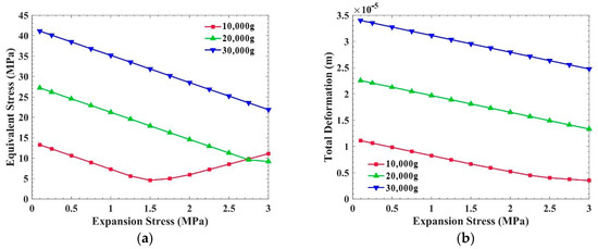 Figure 8 shows the equivalent stress and the total deformation of the PCB, with expansion stress inside, when the overload is 10,000 g, 20,000 g, and 30,000 g. The equivalent stress in the PCB decreases with the increase in the expansion stress generated by the potting adhesive. However, under 10,000 g overload, when the expansion stress is greater than 1.5 MPa, the equivalent stress increases with the rise in expansion stress. This is because when the expansion stress is too large, exceeding the demand of overload resistance, the expansion stress will increase the stress in the PCB. In other words, the expansion stress can reduce the stress in the PCB, but the expansion stress should not be too large. In Figure 8b, the total deformation of the PCB decreases with the increase in expansion stress.