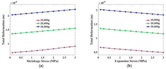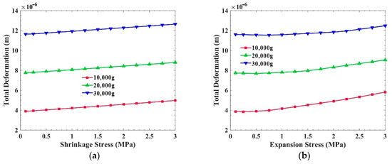 Figure 10. Influence of the different internal stresses of the potting adhesive on the total deformation of the PCB which is parallel to the overload direction: (a) Shrinkage stress; (b) Expansion stress.