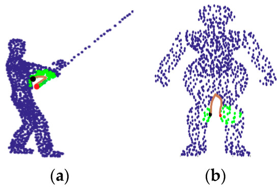 The non-adaptive neighborhood selection, such as the k-NN method and spherical neighborhood method, may result in pathological neighborhoods. Figure 1 shows two point cloud models with such pathological neighborhoods, where the k-NN method is used to find the neighborhood (marked as green points) of the red point, and the brown line indicates the geodesic distance from the red point to one of its pathological neighborhood points (the black point). For the red point at fishing rod in Figure 1a, its correct neighborhood points should also be points at the fishing rod, but not the points representing the fisherman. For the red point on a man’s right knee in Figure 1b, the correct neighborhood points should be the points on the right knee, not the points on the left knee. Obviously, such pathological neighborhoods will lead to the network learning incorrect local information and further lead to pathological inferences. It is clear that discarding the pseudo neighborhood points with small Euclidean distance but large geodesic distance is helpful for the network to better understand the local surface information. Since surface-based geodesic topology is conducive to semantic analysis and geometric modeling of objects, He et al. [38] proposed deep geodesic networks for point cloud analysis.
