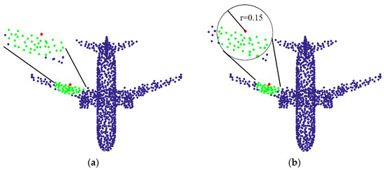 Figure 2 shows the neighborhoods obtained with two common methods, in which the green points are the neighborhood points of the red point. The two methods are the k-NN neighborhood, and the spherical neighborhood, respectively. As shown in Figure 2, for the red point at the wing of the aircraft, theoretically, the network is expected to learn the features of the edge of the aircraft wing, rather than the features of the plane of this region. Therefore, it is better to remove points on the plane of the wing as much as possible to reduce the impact of these points on the network, but retain points at the edge of the wing. This indicates that the following problems are worth to be considered: