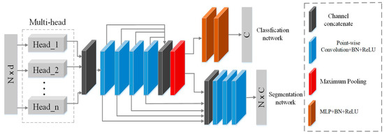 The proposed DNet utilizes the attention mechanism and masking mechanism to learn the more effective feature Feff(Pi). The main modules in the proposed DNet are the multi-head structure, which allows the network to learn information of different neighborhood ranges of the point clouds, that is, multi-scale features, so as to obtain sufficient context information and stabilize the network. Given a point cloud P, the effective feature F(P) of the point cloud learned by the multi-head structure can be expressed as follows