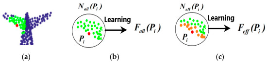 As an example, Figure 4 shows the feature learning with two different neighborhood methods, where the green and orange points mark the neighborhood of the red point. In the figure, since the red point is located at the edge of the airplane wing, the feature of the red point should reflect the characteristics of the wing edge. It is seen that for the Nall(Pi), which is selected with k-NN method, some of the neighborhood points are not suitable for the feature learning of the wing edge. By contrast, the effective neighborhood Neff(Pi) marked as the orange is more helpful for learning the features of wing edge. In other words, Neff(Pi) is more expected for feature learning of the edge of the airplane wing compared with Nall(Pi).