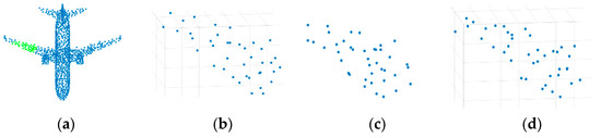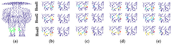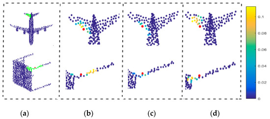 In Figure 6, as shown in the right colored bar, the closer the color of a neighborhood point is to yellow, the more features the network learns from the neighborhood point when processing the local region of the red point. Figure 6a shows the input models in which the green points indicate the initial neighborhood of the red point. Figure 6b–d show the contribution of the neighborhood points learned by the three heads to the center point. It is clear that the neighborhood range learned by each head is different. From the Figure 6, there are two points worth noting. Firstly, it is not that the closer the neighborhood point is to the red point, the more important it is; secondly, since the red point is at the edge of the airplane wing, the contribution degree of other edge points is significantly higher than that of the point on the wing plane. This indicates that the network is more willing to learn local features that are conducive to understand point clouds.
