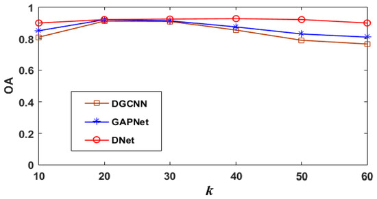To test the influence of the number of initial neighborhood points k on the networks, GAPNet [17], DGCNN [35], and the proposed DNet are compared with each other, and all of them are the k-NN neighborhood-based networks. In the experiments, k is set to 10, 20, 30, 40, 50, and 60, respectively, and the networks are trained at each k separately, without using any data augmentation techniques. Figure 9 gives the corresponding OAs of the three networks with respect to each k. As shown in Figure 9, GAPNet and DGCNN achieve their highest accuracy when k is 20, and then the accuracy decreases with the increase in k. By contrast, the proposed DNet can achieve higher accuracy under more neighborhood points benefiting from the attention mechanism and masking mechanisms, and the highest accuracy is achieved when k is 40. On one hand, more initial neighborhood points can ensure that there are enough points describing the local region to be included in the network learning. On the other hand, the masking mechanism can filter out the pseudo neighborhood points with low contribution which are not conducive to the correct learning of the network. Therefore, the proposed DNet achieves higher classification accuracy.