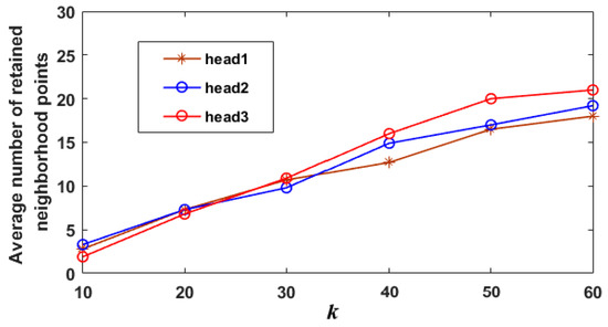 Additionally, in order to further analyze the influence of the number of initial neighborhood points on the performance of multi-head structure, the average numbers of the neighborhood points retained by the three heads of DNet are calculated, as shown in Figure 10, where all “airplane” models are used for the calculation. It should be noted that the neighborhood points retained by the three heads are the real learning content of the network. As shown in Figure 10, when the number of initial neighborhood points, k, is small, the average numbers of neighborhood points retained by the three heads are similar, and this will reduce the ability of the multi-head structure to capture multi-scale features. However, when k reaches 40, 50 or 60, the difference of the number among the three heads is obvious, indicating that the multi-head structure can capture multi-scale features. However, if k is too large, it will increase the burden of searching neighborhood and wash out high-frequency features [45], so k is set to 40 in this work.