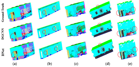 Figure 11 shows some of the part segmentation results, where Figure 11a shows the ground truth of the part segmentation. In Figure 11, the parts marked with red circles are segmented incorrectly by PointNet++ and DGCNN, while the segmentation results achieved by the proposed DNet are consistent with the ground truth. The segmentation results of PointNet++ and DGCNN at some of the parts of the connection are incorrect, while the DNet can predict these parts better. From the perspective of an effective neighborhood, the proposed DNet assigns lower contribution degree to the neighborhood point whose label is different from that of the central point, thereby the segmentation accuracy of the proposed DNet is improved.