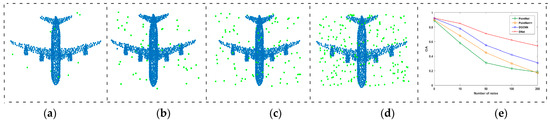 In order to verify the robustness of the proposed DNet, uniform noise is added to the point cloud models in the testing set of the ModelNet40 dataset, and the number of noise points is set to 10, 50, 100 and 200, respectively, as shown in Figure 14a–d. Since the input points of networks are uniformly sampled from the point cloud model and normalized into the unit circle, the coordinates of the added noise points are also limited to the range of [−1, 1]. The training set is noise-free, and the data augmentation is not used in the training process. The final result is shown in Figure 14e, where the abscissa is the number of noise points, and the ordinate denotes the overall accuracy of classification of a network. For the four comparison networks, it is seen that the classification accuracy decreases at different rate with the increase in the number of noise points. PointNet does not consider the neighborhood, so it is most affected by noise points. PointNet++ and DGCNN are relatively better than PointNet. By contrast, the proposed DNet further considers the dynamic neighborhood, so it has strong robustness to noise compared with the other three networks.
