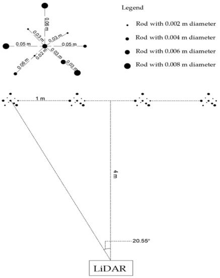 Bird’s-eye view of the group of rods trial setup. One group of rods formed a geometrical shape and rods were at the same height with different diameters. Black dots are symbols to show rod diameters. The LiDAR was placed at 4 m distance from the groups of rods and the view angle of the outermost groups of rods was 20.55 on either side of the centre ‘line’.