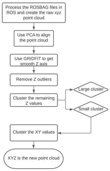 Pre-processing steps such as removal of noise and dimensional smoothing were performed on the point cloud data (Figure 4). The dimensionality of each recorded point cloud was reduced using the principal component analysis (PCA). The analysis was performed in Python 3.7 using Sklearn package and the optimal alignment axes of the point clouds were computed within the PCA axes. After alignment, the xy axis formed the ground plane and the z-axis formed the vertical axis. The values along the aligned z-axis were smoothed using GRIDFIT surface modelling tool in MATLAB R2019b [39]. The surface modelling was created from the aligned data by fitting a surface from the form z (x, y) to the aligned data. An approximation of the raw (x, y, z) point cloud was created as the new point cloud (X, Y, Z) using surface modelling. The outliers were removed from Z values and the data was prepared for clustering.