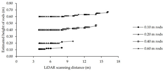 A line of grouped rods was scanned by the LiDAR at different scanning distances with a range of LiDAR vertical angles. The actual height of each group of rods was compared to the LiDAR-estimated heights. There was no group of rods detected when the LiDAR scanning distance from the line of the rods was 20 m (data not shown). The groups of rods at 0.05 m height were not detectable at any scanning distance by the LiDAR (data not shown). As the distance of the LiDAR from the groups of rods increased, the estimated height of the rods also slightly increased above their actual height (Table 3 and Figure 6).