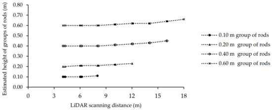Comparison of the actual height (0.10, 0.20, 0.40 and 0.60 m) and LiDAR-estimated heights at different scanning distances of 4 to 16 m for the groups of rods.