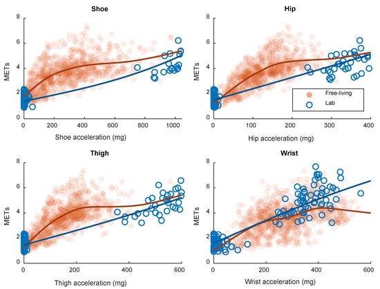 The activity types of the present sample in the free-living setting have been reported previously [10]. Among the observed activities, 82% were considered either sitting or standing. Sitting and standing are typically considered sedentary activities and are associated with an EE of below 1.5 METs [2,18]. In the validation part of this study, the measured EE is considerably higher than 1.5 METs most of the time. However, this is in line with previous research, where sitting and standing activities in a workplace setting typically reach between 1.5 and 4.5 METs [18]. Similarly, when comparing previously published accelerometer cut-points for EE, cut-points retrieved from calibrations based on locomotive activities are higher than cut-points retrieved from household activities [19,20]. Previously published cut-points using the same data processing methods as in the current study have all been using locomotive activities for calibration and the cut-points are similar to the cut-points from the laboratory calibration in the current study [7,14]. This explains the lower acceleration cut-offs for the hip, thigh and shoe sensors from free-living data compared to laboratory data in Table 3.
