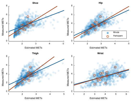 Correlation plots between estimated and measured energy expenditure (METs) based on minute-by-minute measurement and participant mean (free-living part).
