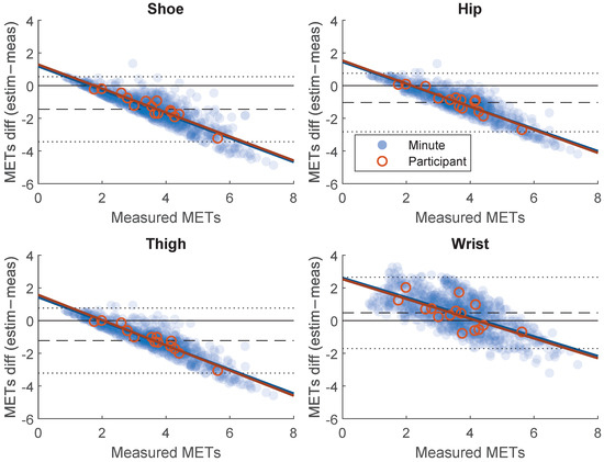 Bland–Altman plots of the agreement between estimated and measured energy expenditure (METs) based on minute-by-minute measurement and participant mean (free-living part). Dashed line represents mean difference and dotted lines represent limits of agreement (±2 SD).