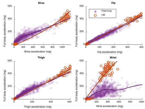 Association between single-accelerometer output and full-body acceleration in laboratory and free-living, based on smoothing splines.