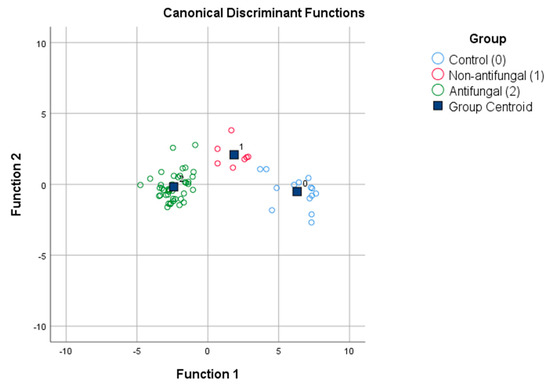 The results of the measurements using the electronic nose were analysed by IBM SPSS Statistics. Three groups were created, one each for the ethanol control, antifungal samples, and samples with less active antifungal properties. Discriminant analysis was used to determine whether the different groups separated from each other. Figure 2 shows marked separation of the different samples: the control samples, samples with antifungal properties, and samples with less active antifungal properties are clearly detached from each other, making distinct group centroids. The stepwise method resulted in correct classifications in 98.4% of original grouped cases but, using cross-validation, 95.2% of grouped cases were classified correctly (Table 3).