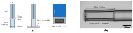 The sensor assembly procedure can be divided in two processes: the air cavity assembly and the deposition of the GO membrane. The air cavity was achieved by fusion splicing a single mode fiber (SMF) to a hollow silica capillary. The silica capillary presented an inner diameter of around 75 µm and an outer diameter of 125 µm, equal diameter as the SMF. The fusion splicing process was achieved using a fusion splicer machine (Type-71C, Sumitomo Electric, Osaka, Japan) in a manual setting. The fusion process was performed centered at the SMF, using a lower power electric arc. This process avoids the collapse of the capillary in order to minimize losses at the interface [33]. Afterwards, the capillary was cleaved to the desired length using a fiber cleaver. The cleaving process was controlled by a stereoscopic to analyze capillary length as well as cleave quality.