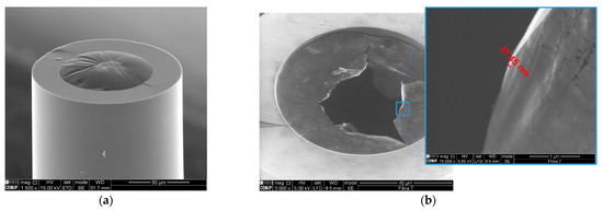 A scanning electron microscope (SEM) image of a GO membrane is also presented in Figure 2a. The attained membrane is mainly homogeneous with a central region with higher density. The radius of the membrane is determined by the internal radius of the silica capillary, which is 75 µm, and the thickness of the membrane can be estimated using SEM images of ruptured membranes as presented in Figure 2b. For this, several membranes were fabricated and ruptured using an ASE (amplified spontaneous emission) light source with 100 mW peak power. An approximated value of 40 nm was attained, less than half of the value presented by Yu Wu et al. [32].