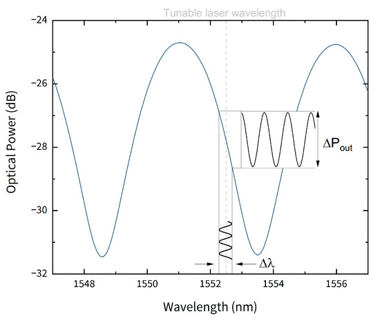 Reflected spectrum of the sensor. The tunable laser wavelength is marked in dashed line.